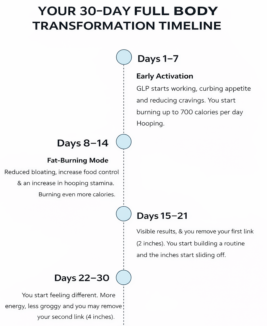 You’ll receive a comprehensive 30-Day Transformation System which includes a slimming belt, GLP-1 slimming patches for enhanced metabolism, and herbal detox tea. These components work synergistically to maximize your fitness results and promote holistic wellness.